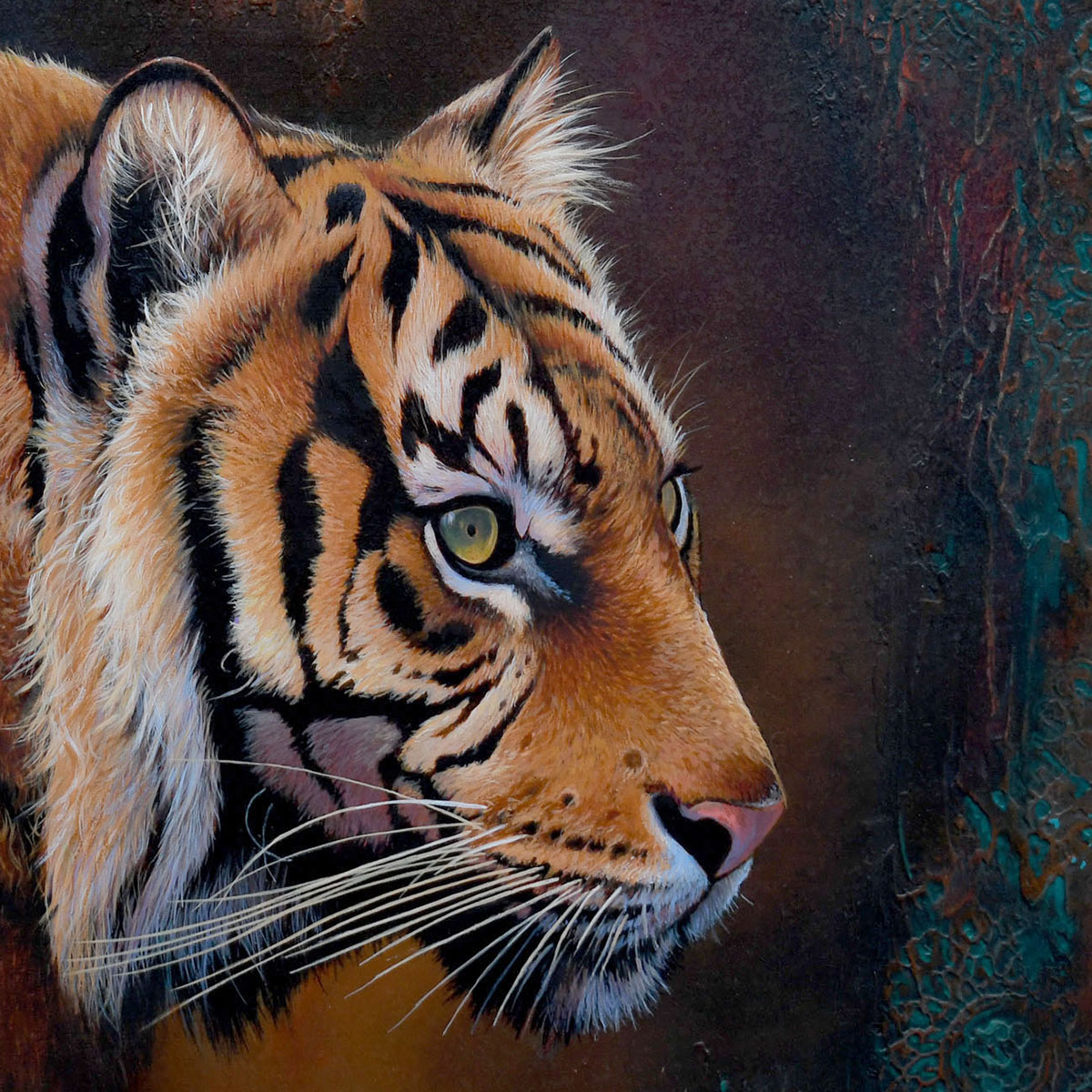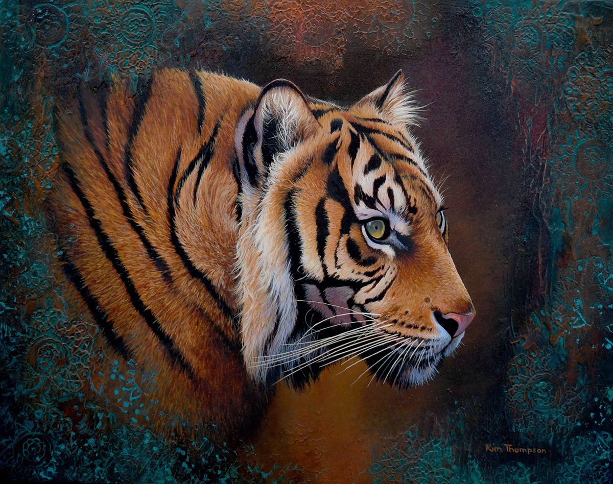 The natural world inspires the work of nature artist, Kim Thompson . She studied wildlife illustration at Dyfed School of Art, West Wales, graduating in the late 1980s and then working in book and magazine publishing. This training, which included taxidermy and field studies, instilled a fascination with nature and strongly influenced her painting style. Kim works primarily in acrylics and oils, creating paintings with vibrant, textured backgrounds as well as more traditional wildlife and animal, portraits studies and landscapes.