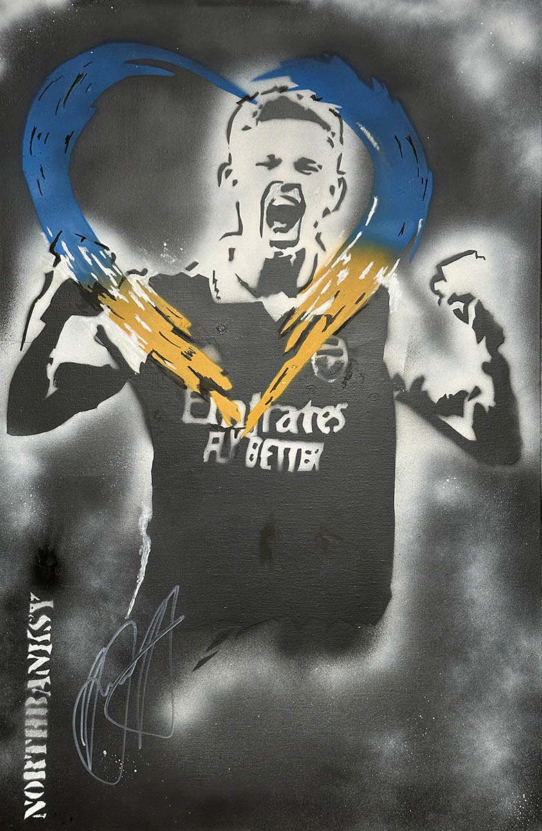 This is a one-off piece made exclusively for Art Aid Ukraine. It will remain the only printed version of this iconic image of Arsenal and Ukraine footballer Oleksandr Zinchenko who has personally signed it.