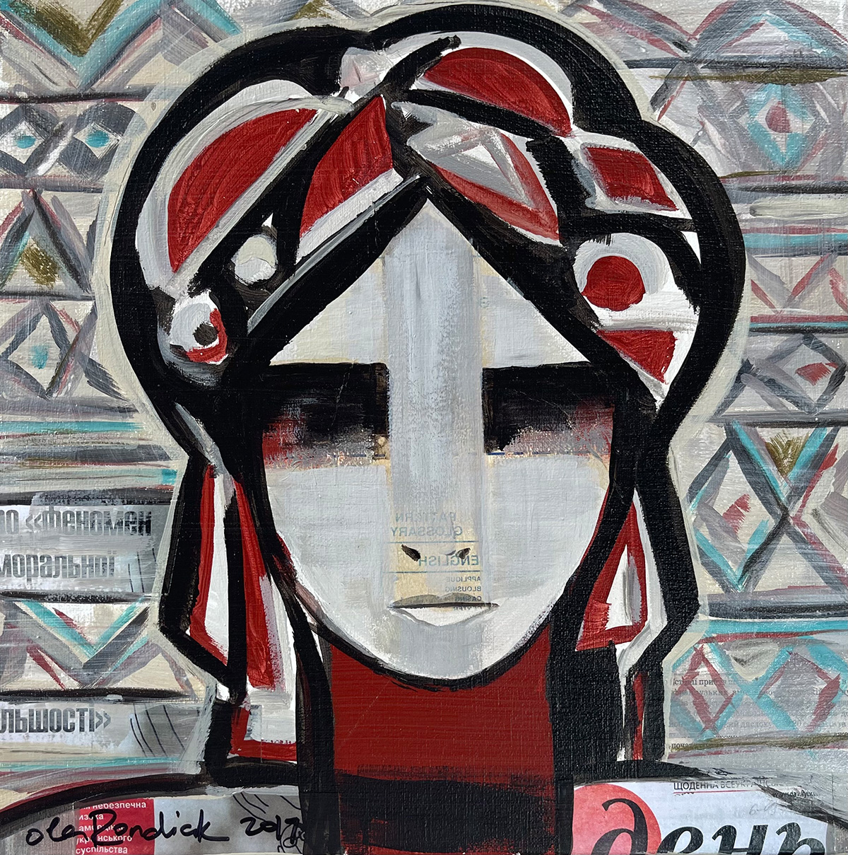 The geometric sewing patterns which underline the form of these emotive portraits were inspired by thoughts of her grandmother secretly at work creating embroidered icons, considered illegal in the harsh Soviet gulag.