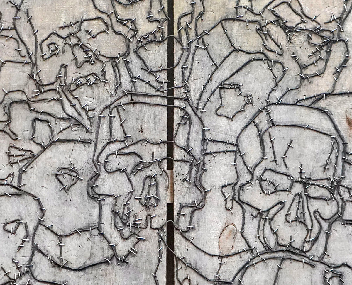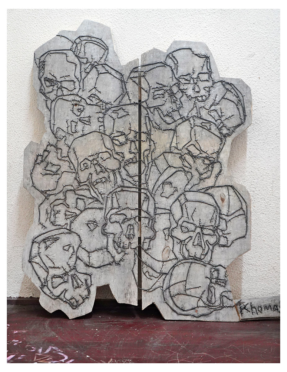 Vitaly Khoma is a contemporary Ukrainian artist, based in Kyiv. He graduated from the National Academy of Fine Art and Architecture, Kyiv in 1997. During his career, he participated in various exhibitions and residences both in Ukraine and abroad, such as The international contemporary Art Fair in Essen, Germany; Dramatic Architecture Project, Sevilla, Spain; Depressed Area, Kavala, Greece; Trienale Art 2018, Kyiv, Ukraine. Vitaly makes his artworks from the fence boards because they “always were material for protests, in which it was possible to express your thoughts, with impunity reproducing them in any form”. Currently, Vitaly is in Kyiv, where he volunteers and continues to create his artworks.