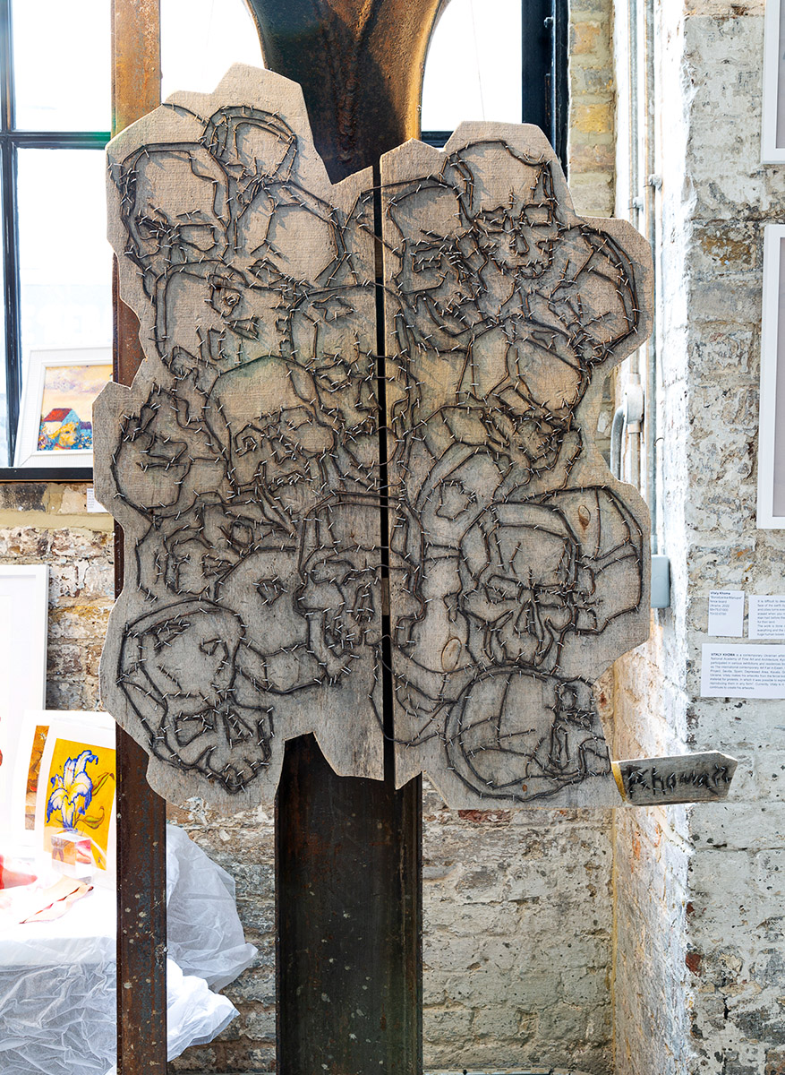 The work is done on a blackened board using iron wire, symbolizing the relativity of everything and the rigidity of the environment. A large number of skulls symbolizes the huge human losses of the Ukrainian population.