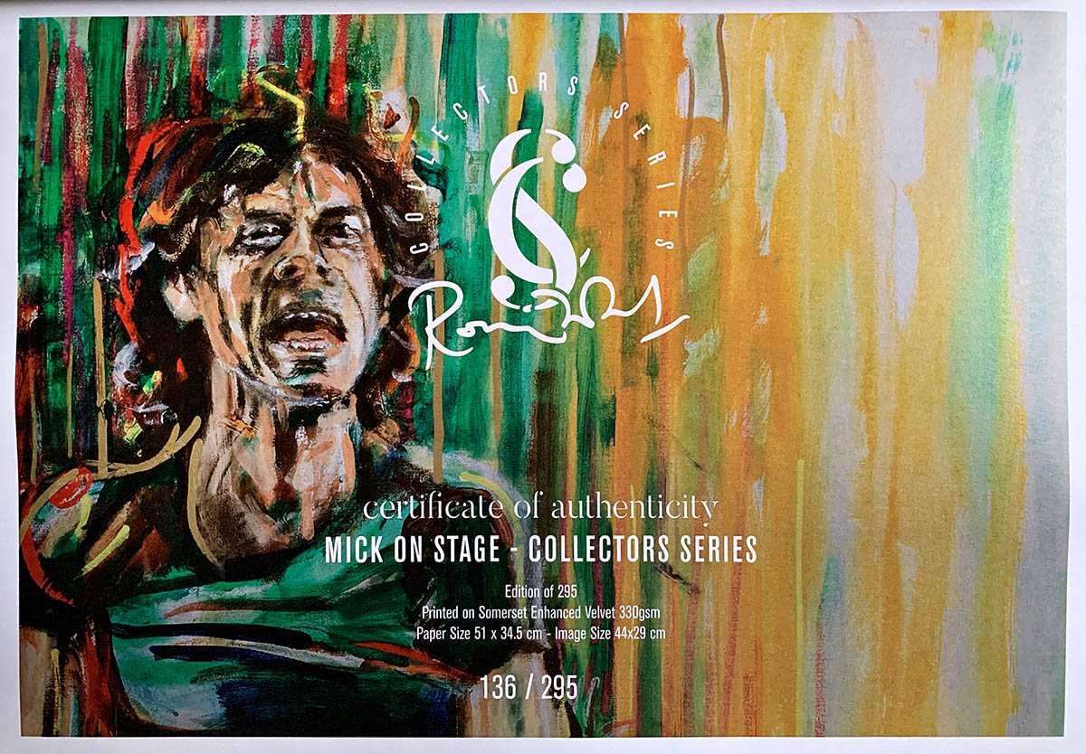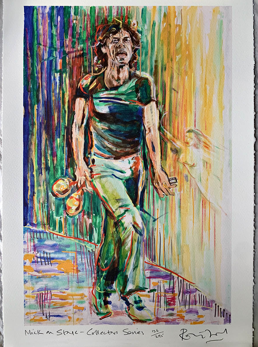 This limited edition print has Mick Jagger on stage in his element with colour and energy flying out from him harmonica and maracas in hand, driven on by an elemental beauty spirit.