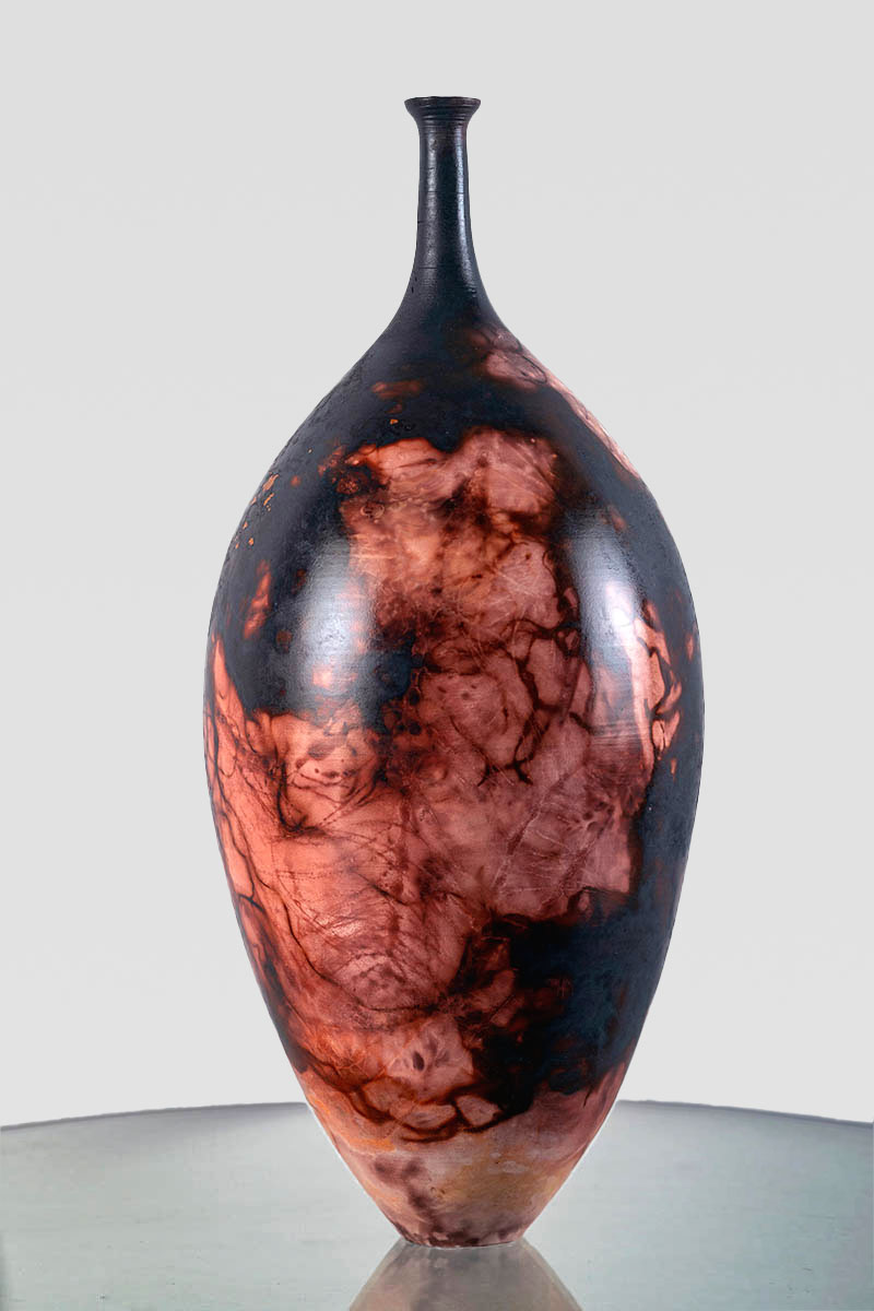 I don’t necessarily want the surface to look too contrived or for each plant to be clearly identified on the surface. I look for a random, layered and abstracted finish to the surface. The vessels are thrown in white stoneware or semi porcelain and are then highly burnished. This is to encourage the fuming process and to capture the delicate qualities of the materials I use in the firing process.