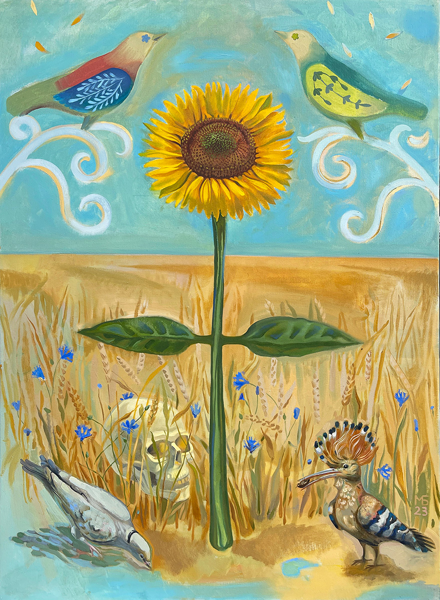 And it turned out to have a multi-layered meaning. Here is our contrasting reality, and memories of the meadows near Vovchansk (Ukrainian town on the border with Russia), where my children played, hiding in the wheat. There are also Christian symbols, such as the Crucifix, Calvary and Adam's skull, as a hint of the path that Ukraine is currently taking