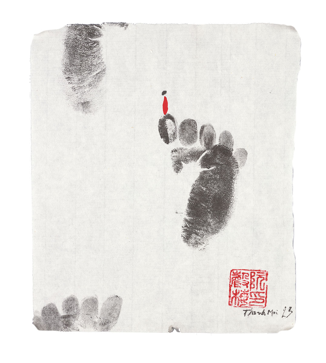To create this one of kind artwork, Thanh Mai chose to use Chinese black ink as her medium, as it allowed her to capture the tiny details of her skin as a metaphor for the baby's foot.