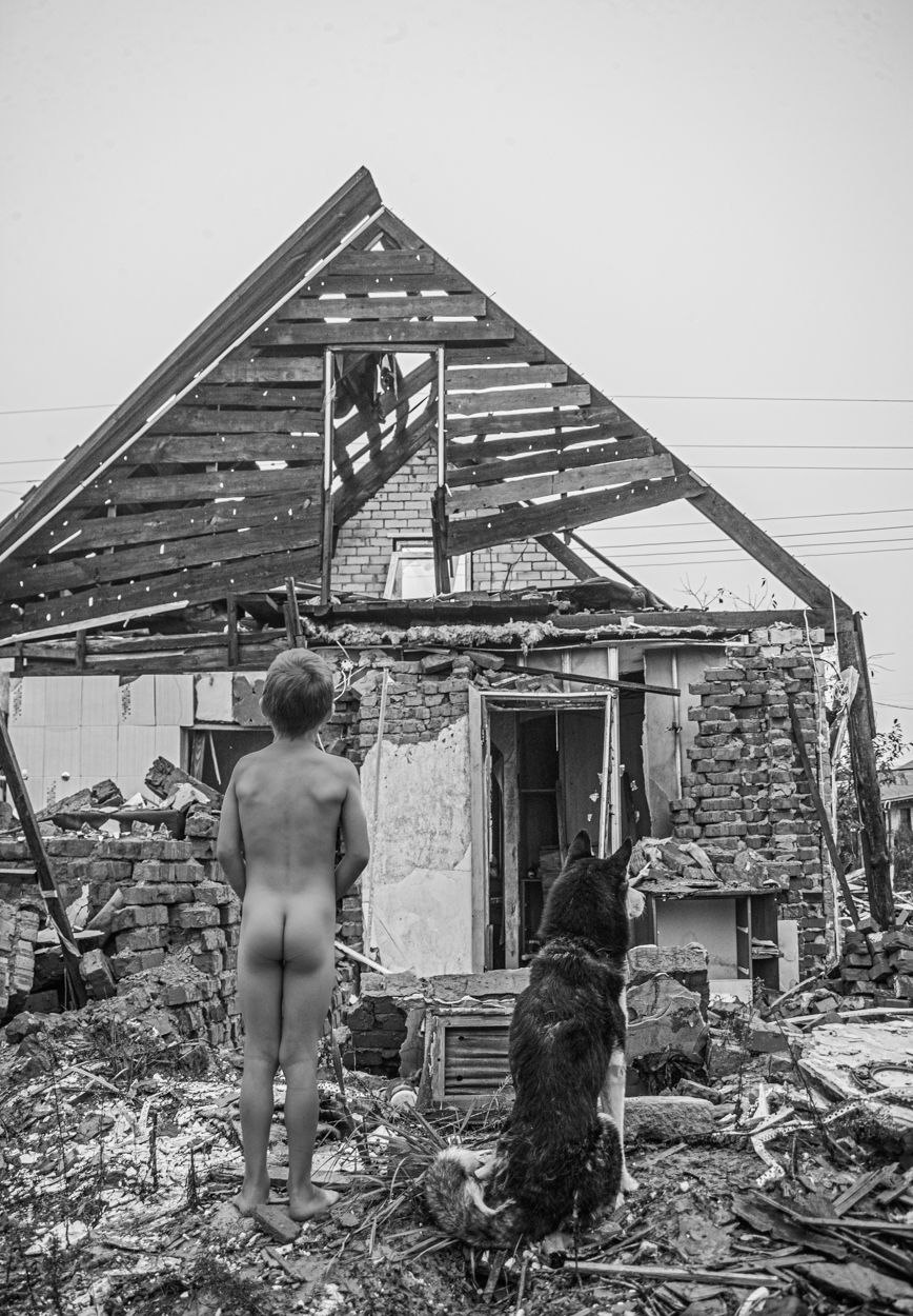 A little boy is keeping his dog on a loose leash as he knows that his only dear creature left alive will remain at his side — an unwavering companion in times of loss.
