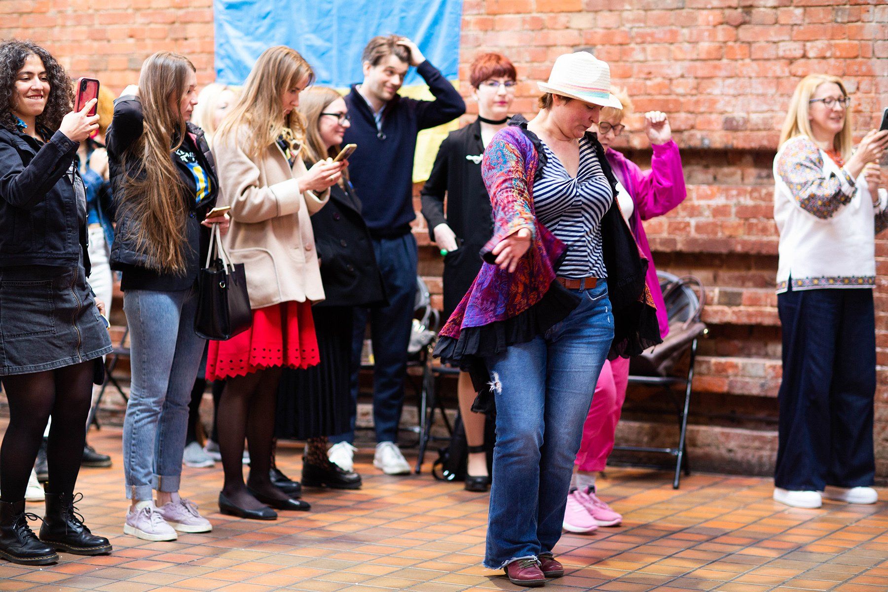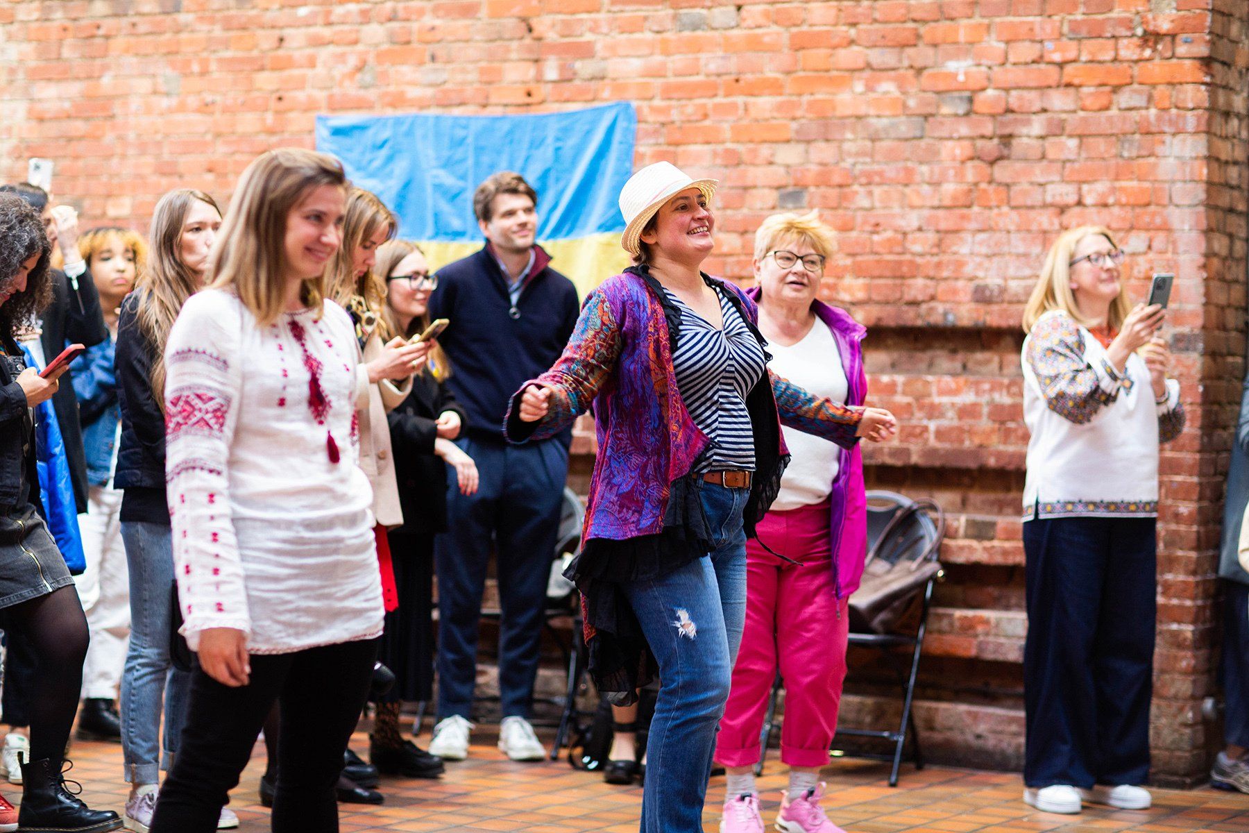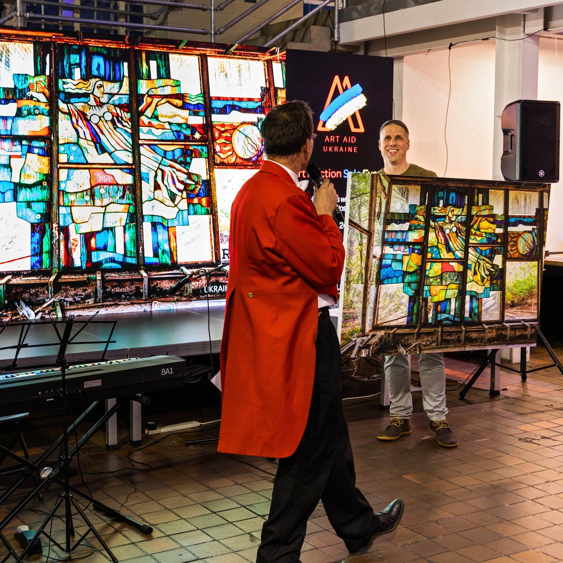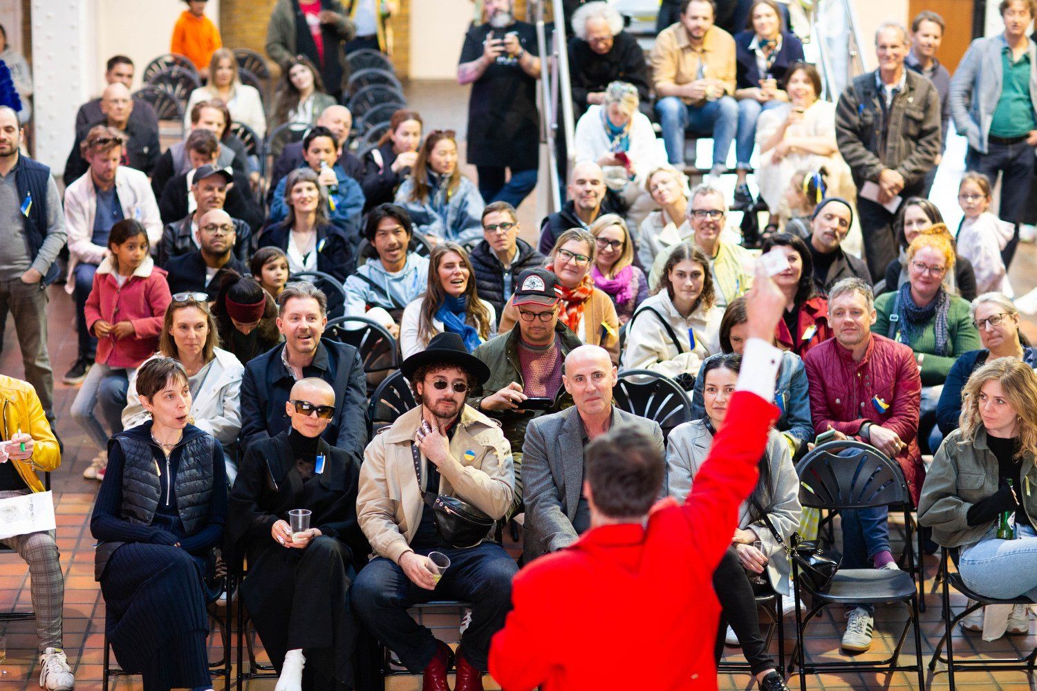 We had 450+ people come. It was a day of heart, smiles and solidarity. The music was great, a brilliant set from Ukrainian legends Vopli Vidopliassova playing live for us on a big screen, The Bloom Twins were wonderful and then we enjoyed the beautiful vocal talents of Alloise and opera singer Oksana Sliubyk. The main event however was the Auction. The man in the Red Coat James Hasler worked with the audience with humour and energy.